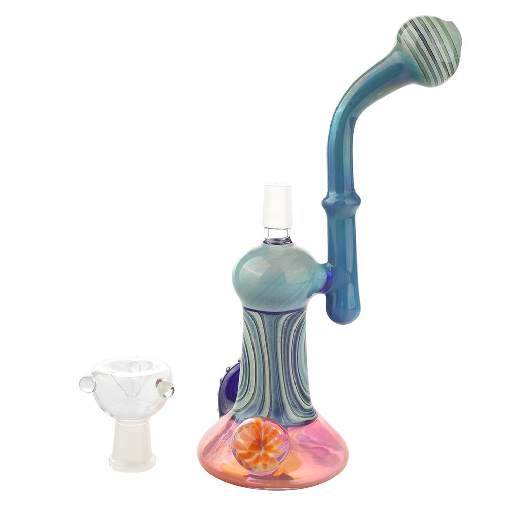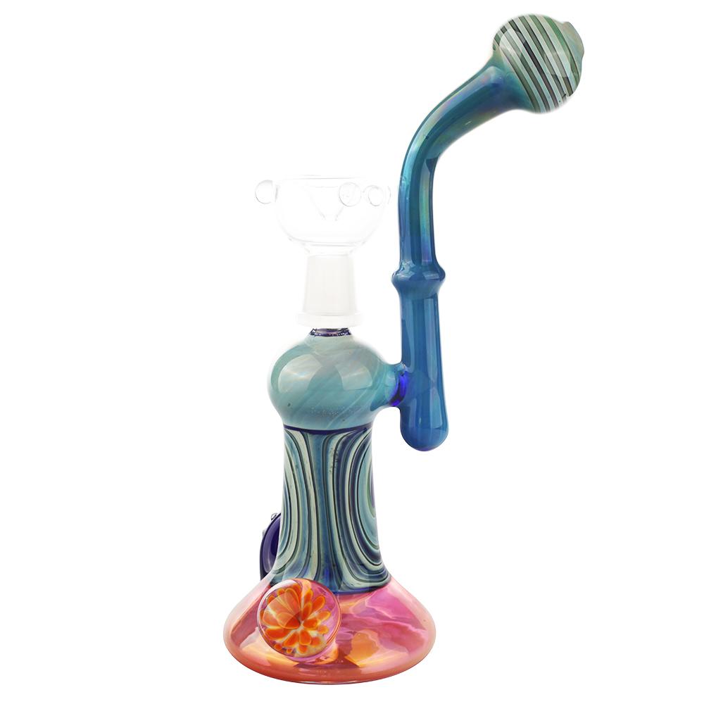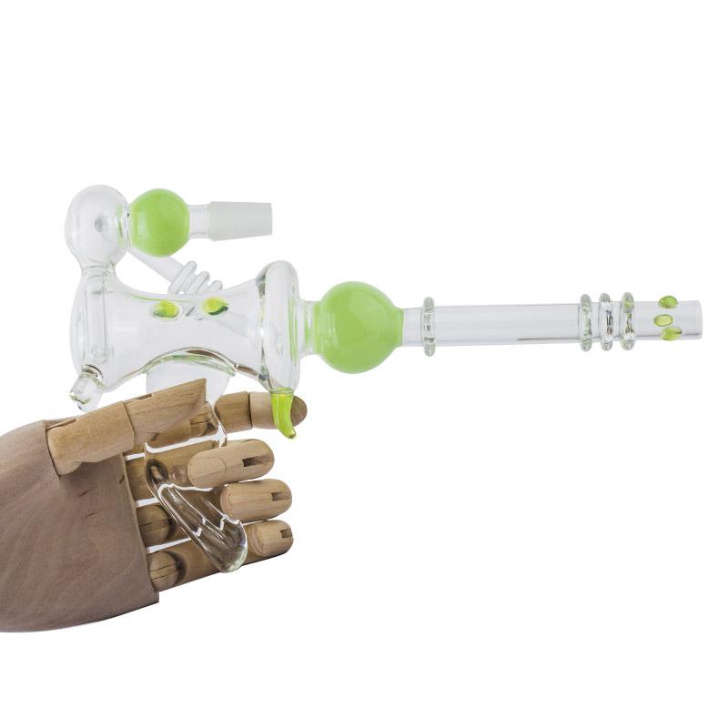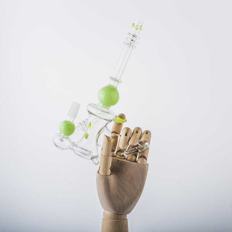 Mini dab rig or nano dab rigs can sit on the palm of your hand, but you can still use ordinary size quartz bangers or titanium nails on them(14mm male or female), but the downside of using a mini dab rig is that they won't be able to contain as much water for chilling the vapor like a normal-sized dab rig. But they are still super fun to use and super lightweight to carry!