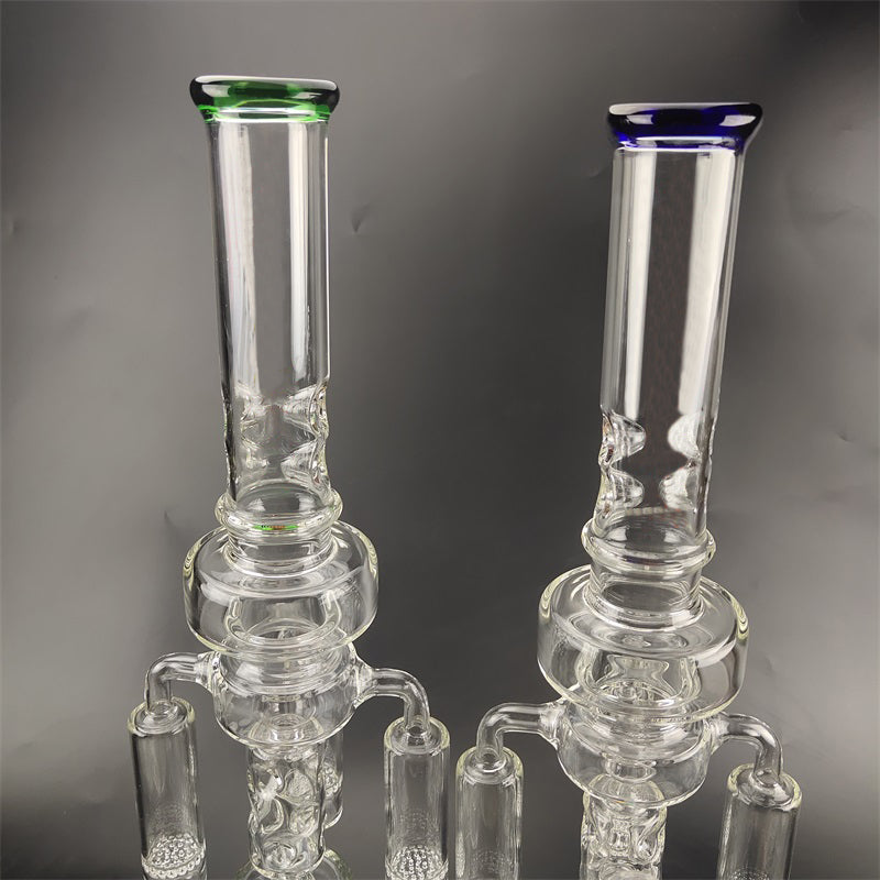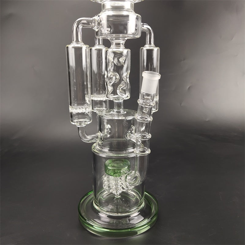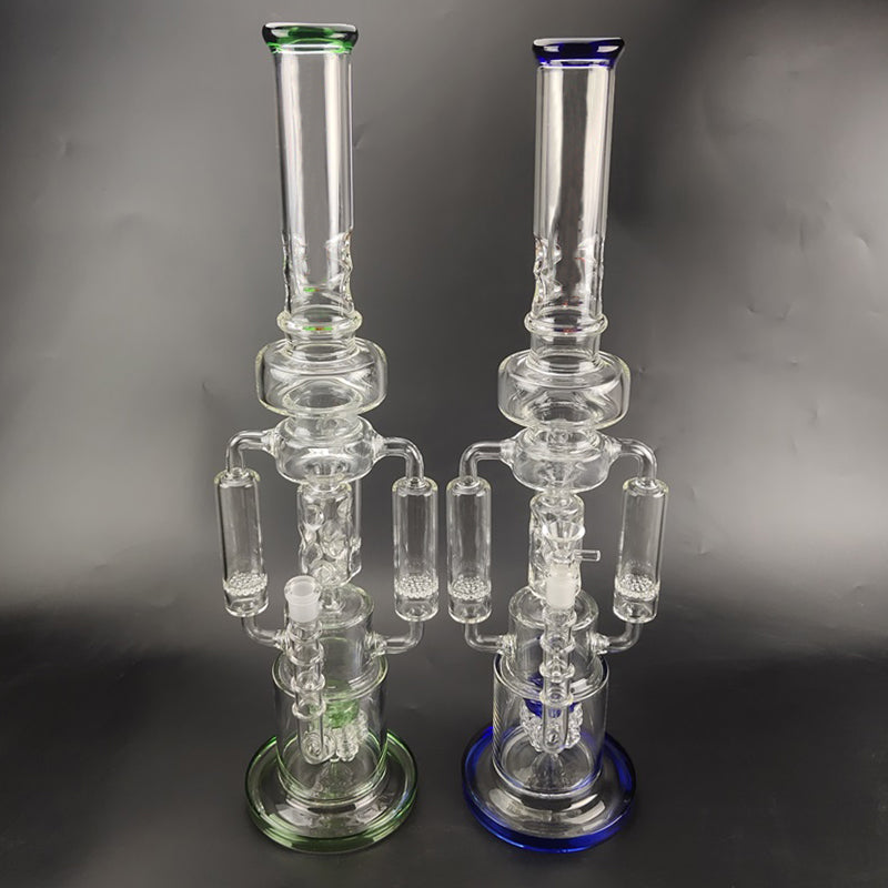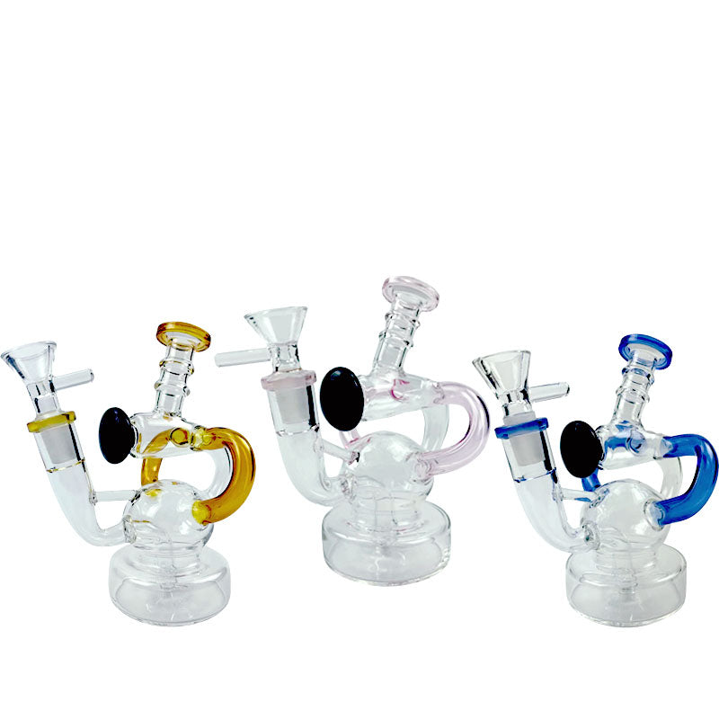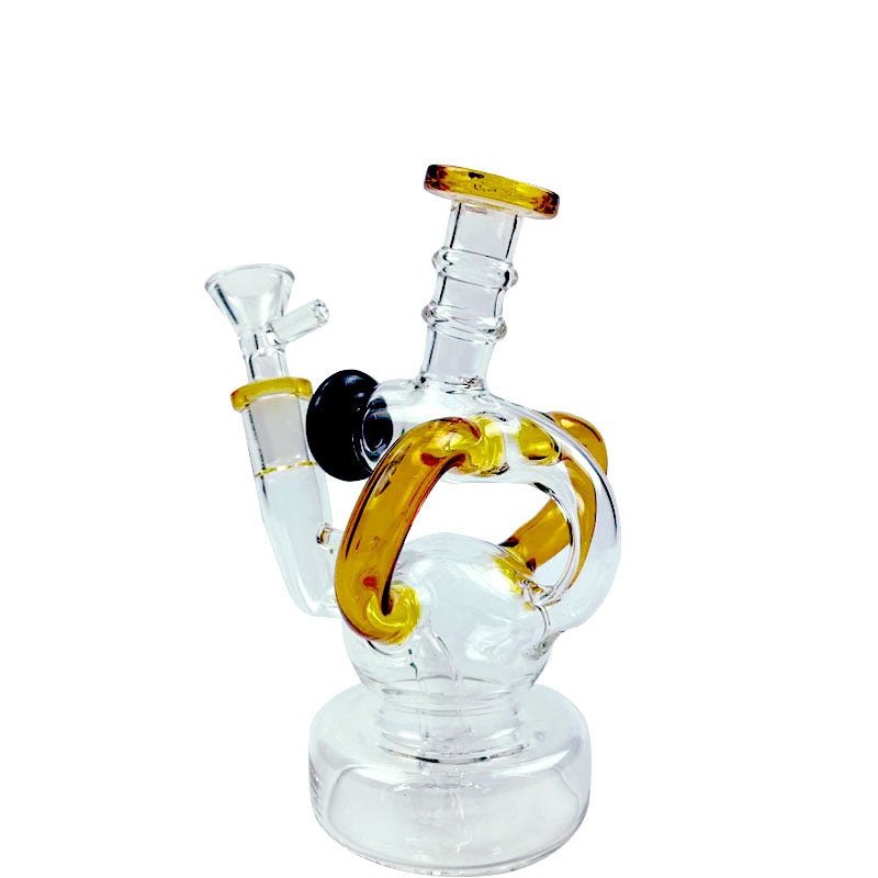 A recycler bong is referring to the type of water pipe(aka bong)that features a "recycling" percolator, sometimes even more than one. The most recognizable cosmetic feature of a recycler bong is the tubing that connects multiple bong chambers when you inhale, the water and the smoke will travel through the tubings, the smoke will be significantly chilled, easier for your throat and your lungs, the water will travel down to its original position hence the recycling process is complete. Recycler bongs are free Canada shipping.